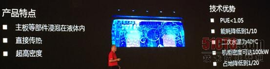 同时在曙光技术大会上展示了另一款高能效的技术,全液冷产品。该产品现在还处于研发阶段,主板等部件全部浸泡在无腐蚀不燃导热性佳的液体里,展区工作人员表示该液体主要成分是油,可大幅降低能耗,相比传统数据中心能耗降低90%以上,PUE可达1.05以下。